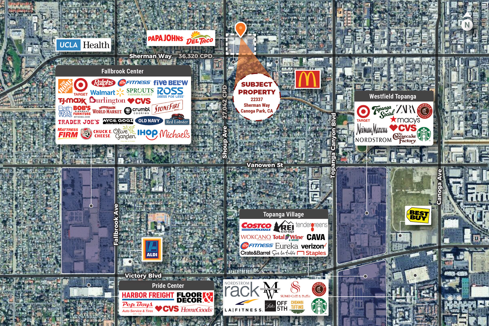 Discover a premier retail opportunity in the heart of Canoga Park, a vibrant submarket of the San Fernando Valley. This well-established neighborhood shopping center, anchored by a high-performing Ralphs grocery store, has recently undergone a remodel to enhance its modern appeal and drive increased foot traffic. Positioned at the signalized intersection of Sherman Way and Shoup Avenue, the property benefits from exceptional visibility, strong daily traffic counts, and a dense, affluent trade area, making it a rare entry point into a highly competitive market with limited barriers to entry.
