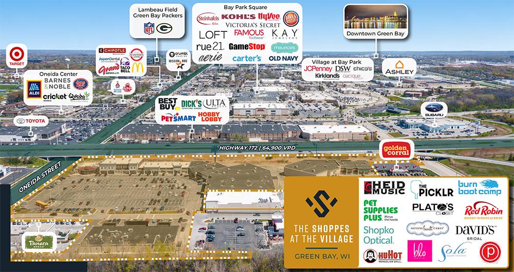 The Shoppes at the Village is a 134,000 SF grocery anchored specialty retail development located on the corner of Oneida Street, Holmgren Way, and Highway 172. This property is impressively situated less than 2 miles from Lambeau field. High visibility from Highway 172 with direct access from the Off-ramp. Highway visible Billboard signage available!