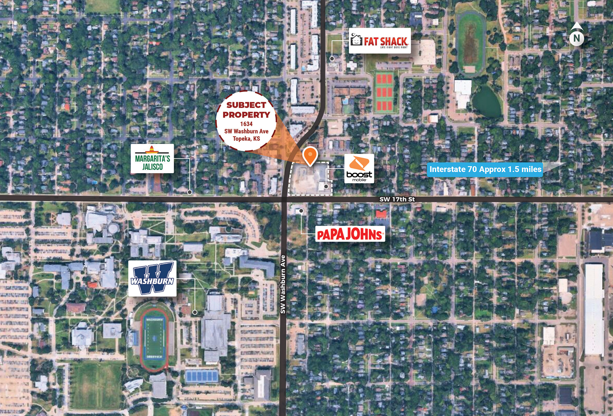 Casey's Now Open! Campus Center is located at 1634 SW Washburn Avenue in Topeka, Kansas on the NWC of Washburn Avenue & SW 17th Street. This is a prime location across the street from Washburn University in a signalized intersection and can be access from all four sides with a total of six entrances. A major remodel is currently planned.